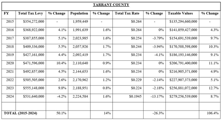 From 2015 to 2024, the county reduced its total tax rate by 26.3%. Simultaneously, total taxable values grew by 106.4%. Hence, rates declined noticeably while at the same time property values surged.