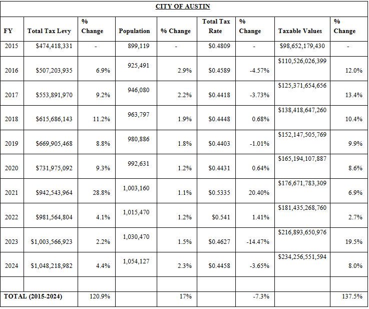 Ideally, an “inverse relationship” exists between rates and values, meaning that as one goes up, the other comes down in relatively similar proportion. In this case, the data shows that Austin’s total tax rate declined slightly over the prior decade but those reductions were overshadowed by a much greater growth in taxable values. As a result, the city’s tax levy increased substantially more than population growth, which offers some insight into Austin’s property tax woes.