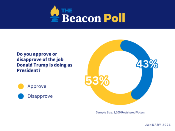 While President Donald Trump’s approval remains solidly above water in Tennessee, it has fallen to its lowest level since the Beacon Poll started tracking, marking a notable shift among voters. Currently, 53% of voters approve of the job he is doing, while 43% disapprove, a six-point difference from the November 2025 Beacon Poll. Trump’s approval remains strong among Republicans (+73%), but it has dropped sharply among Democrats (-77%) and Independents (-14%), reflecting growing dissatisfaction outside of his base.