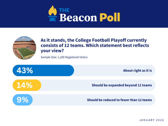 Following a thrilling NCAA football playoff that saw Indiana complete its Cinderella story with a National Championship victory, Tennesseans are divided on what the future should look like for the College Football Playoff. While both the Southeastern Conference and Big Ten want an expanded playoff of 16 or 24 teams, a plurality of voters (43%) believe the playoff should remain at 12 teams. Only 14% favor expanding the field, and just 9% support reducing the number of teams. Thirty percent of voters are not familiar enough with college football to form an opinion.