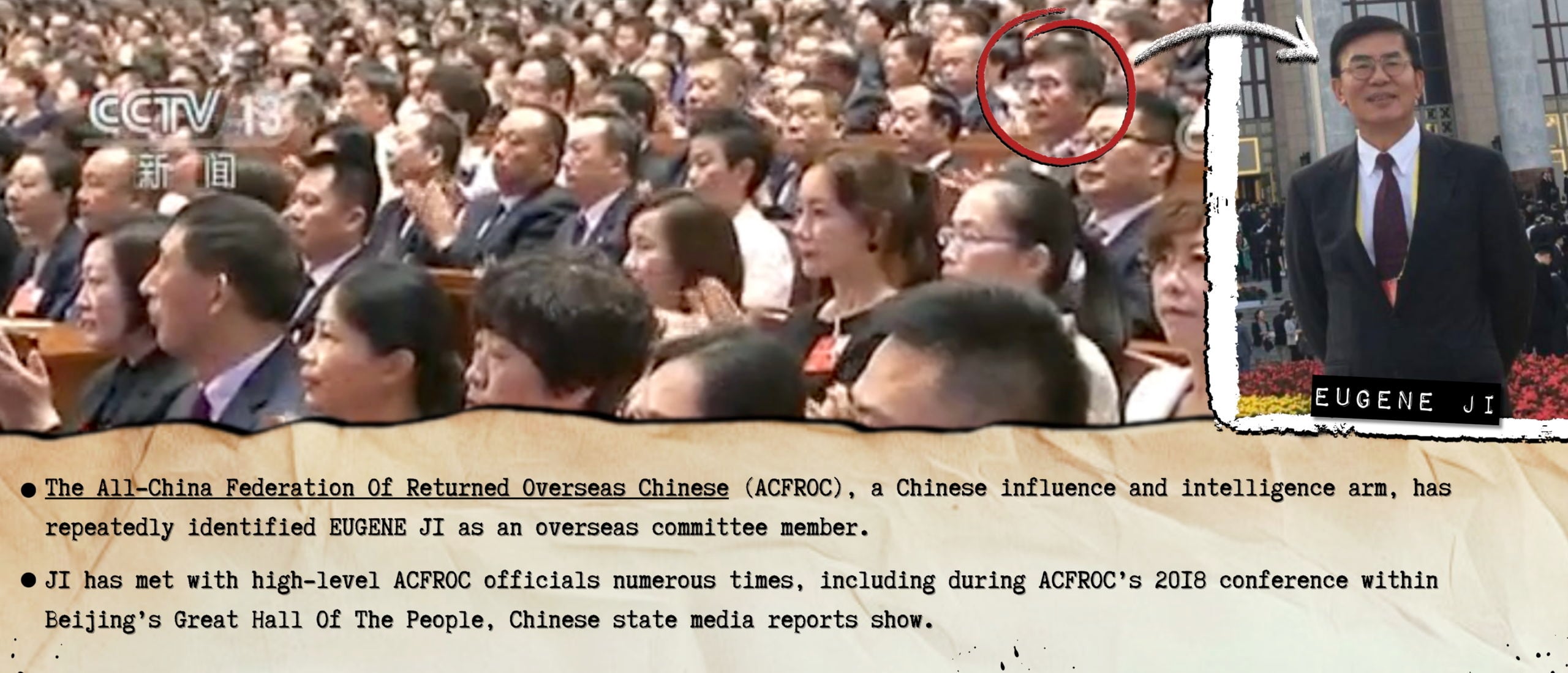 Ji has attended numerous ACFROC meetings in China, including the UFWD arm’s September 2018 Beijing conference, according to ACFROC announcements and Chinese state media footage.