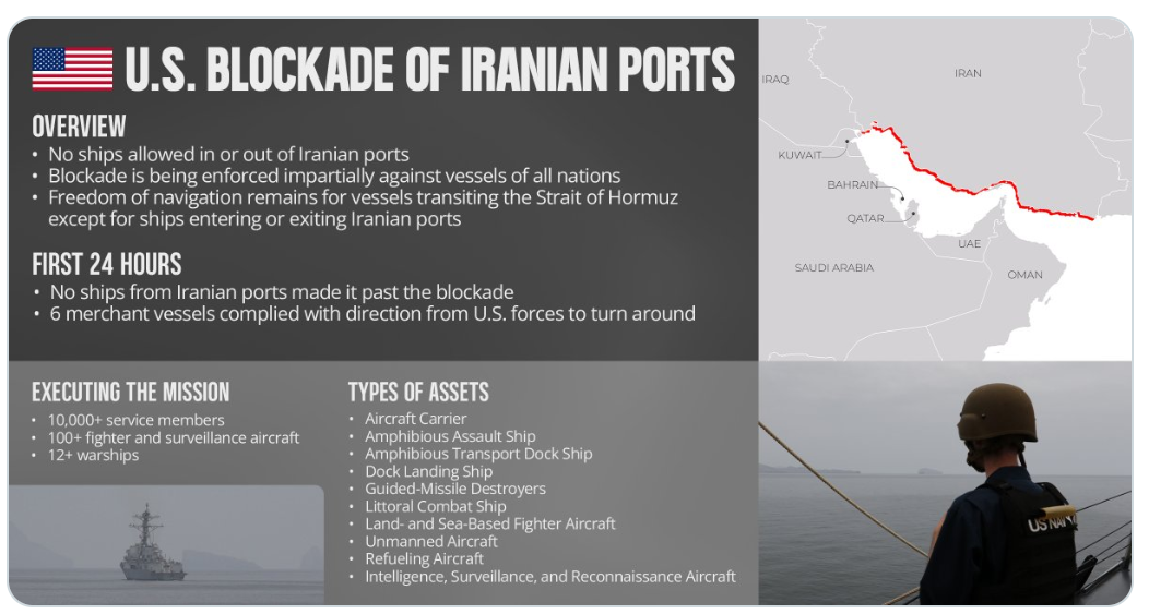 More than 10,000 U.S. Sailors, Marines, and Airmen along with over a dozen warships and dozens of aircraft are executing the mission to blockade ships entering and departing Iranian ports. During the first 24 hours, no ships made it past the U.S. blockade and 6 merchant vessels… pic.twitter.com/dpWAAknzQp