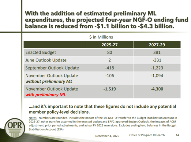 As noted in the forecast, “these figures don’t include any new policy decisions.” What that really means is these figures don’t include any new tax increases that the legislature will be looking to pass in 2026 to fill this gap. This massive hole exists simply to keep the current system running.