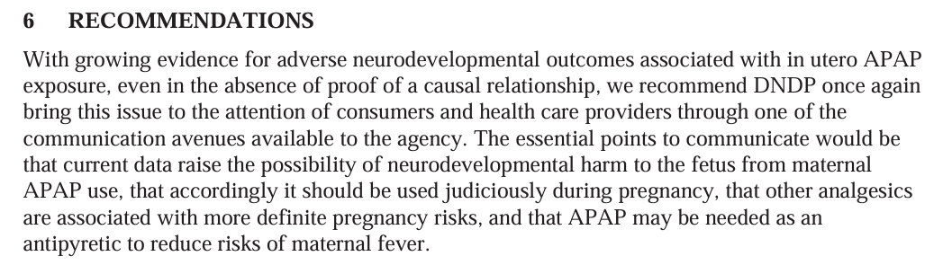 The first sentence of the conclusion of an epidemiological review in 2022 states that “the functional neurobehavioral outcome studies examined in this review along with the reviewed meta-analyses suggest a consistent association between [acetaminophen] or long durations of prenatal [acetaminophen] exposure and ADHD.”