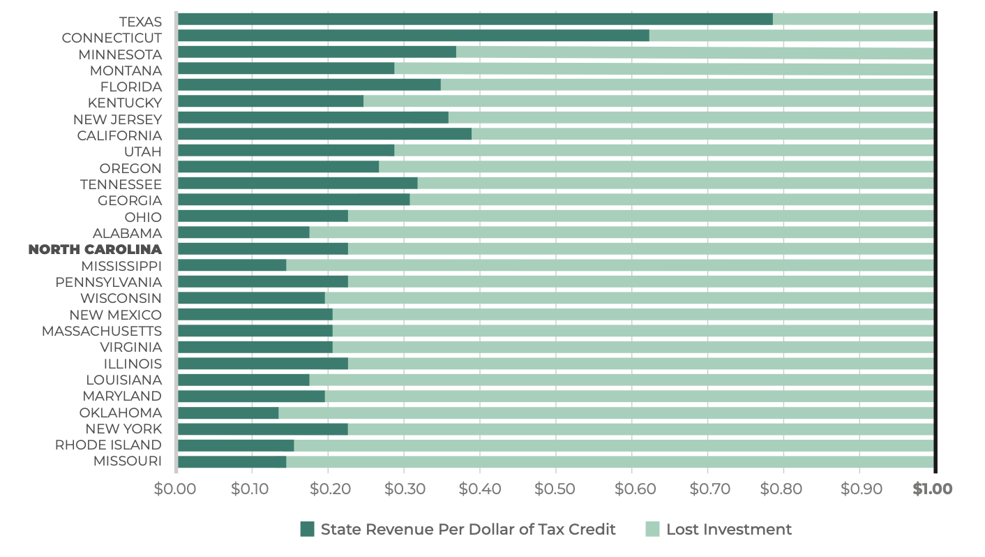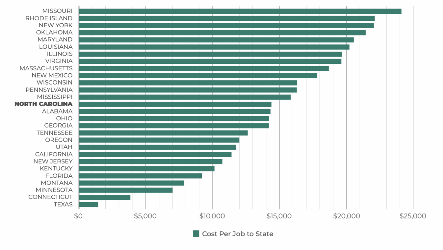 • Multiple third-party studies of North Carolina’s program incentivizing film productions showed negative returns, ranging from just over 19 cents per dollar of tax credit given to a high of 61 cents per dollar (in a study that did not account for opportunity costs and whose authors acknowledged that “a more detailed report is likely to conclude that the loss to the State is even greater”).