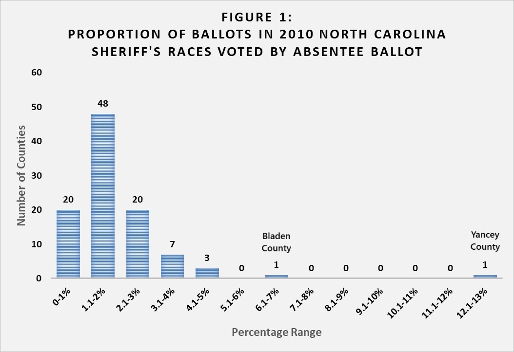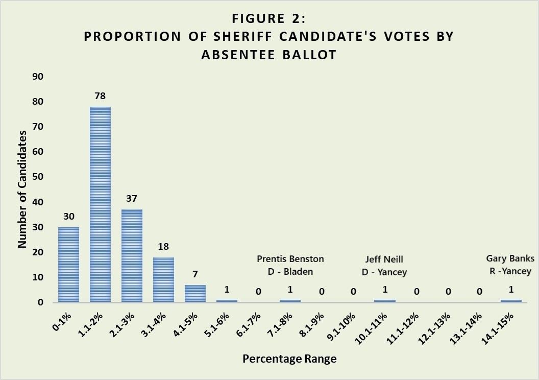 As seen in Figure 2, Gary Banks, the incumbent Republican candidate for sheriff in Yancey County, received a higher proportion of votes by absentee ballot (14.6 percent) than any other candidate for sheriff in North Carolina in 2010. The second-highest proportion was 10.4 percent for Jeff Neill, Banks’ Democratic challenger.
