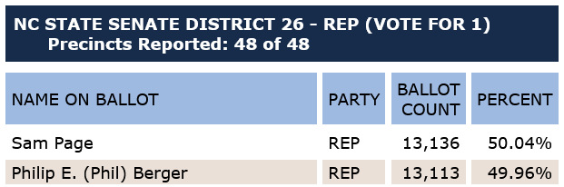 North Carolina county boards of elections completed their official counts in the March 3 primary at their canvass meetings on March 13. In the 26th Senate District Republican primary, Rockingham Sheriff Sam Page finished with a 23-vote lead over North Carolina Senate leader Phil Berger (see the graphic of the official final count from the North Carolina State Board of Elections (SBE) below).