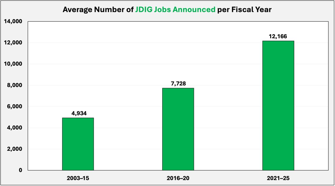 JDIG job announcements have steadily accelerated over time. From FY 2003–2015, JDIG agreements announced an average of 4,934 jobs per year. The average rose to 7,728 jobs from FY 2016–2020 and then surged to 12,166 jobs from FY 2021–2025.