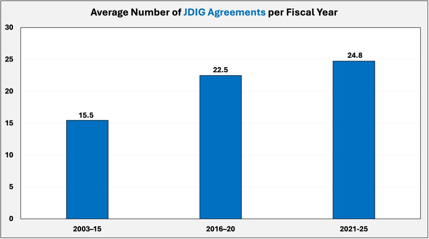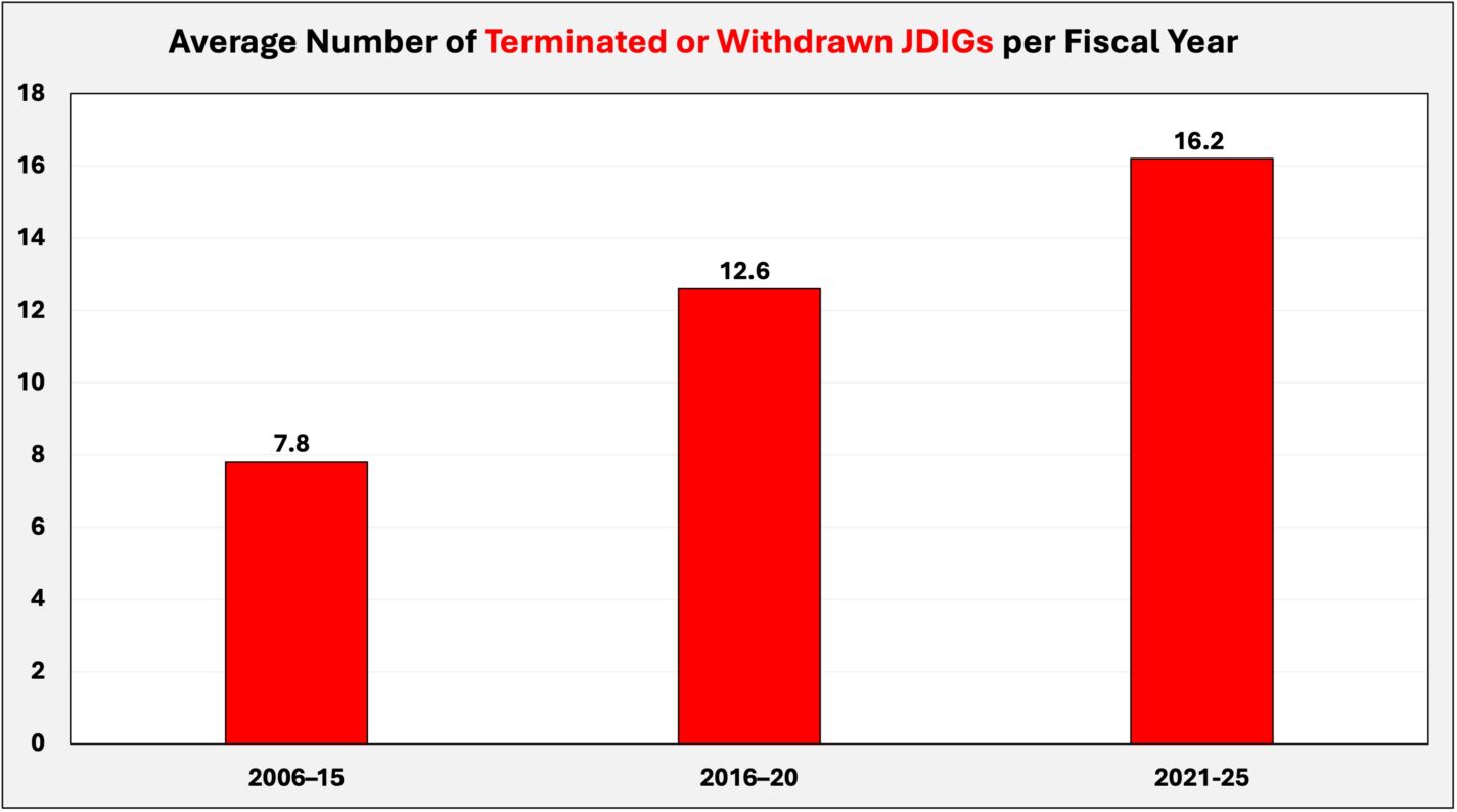 From FY 2006–2015, JDIG averaged 7.8 terminated or withdrawn agreements per year. That figure rose to 12.6 from FY 2016–2020 and climbed again to 16.2 from FY 2021–2025.