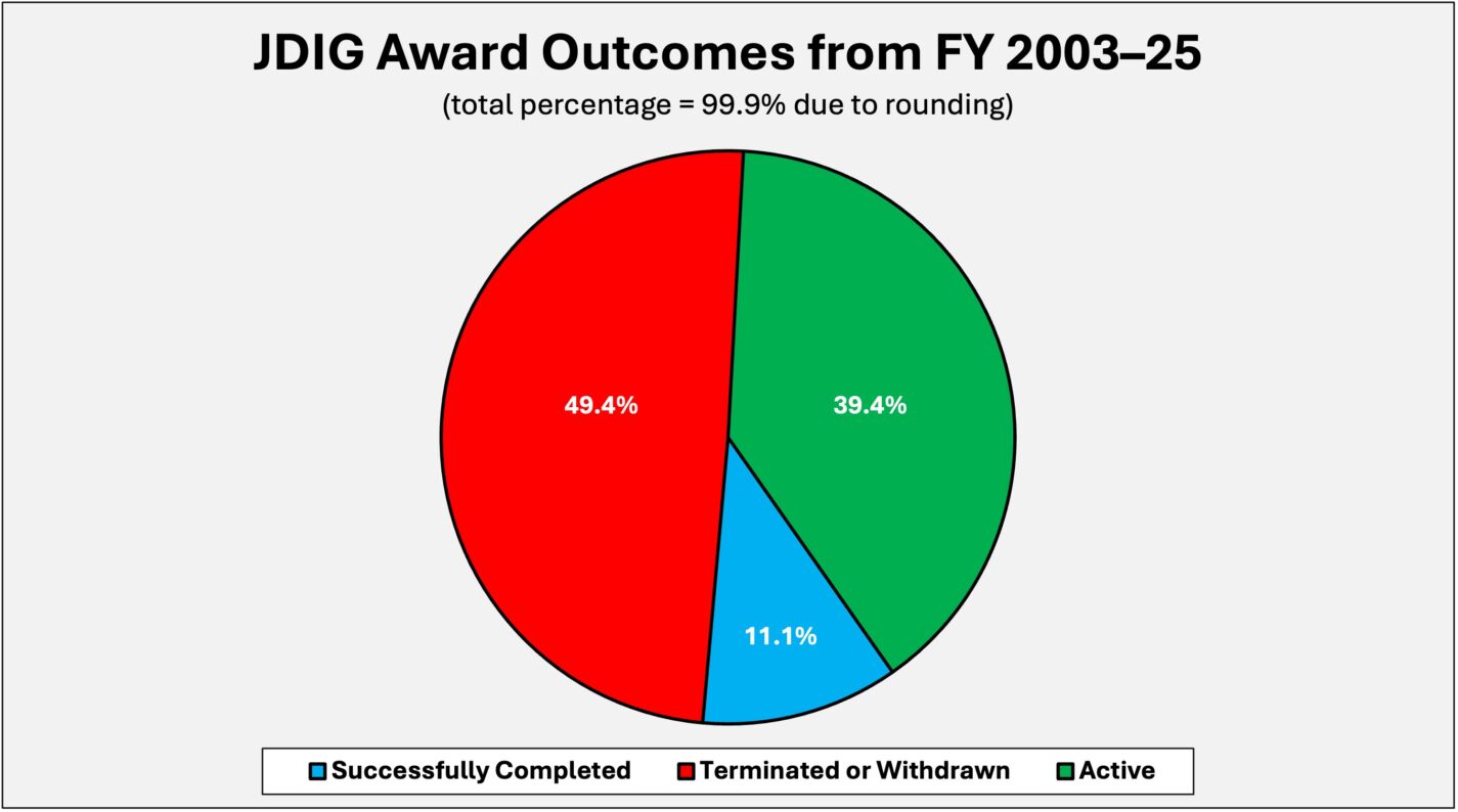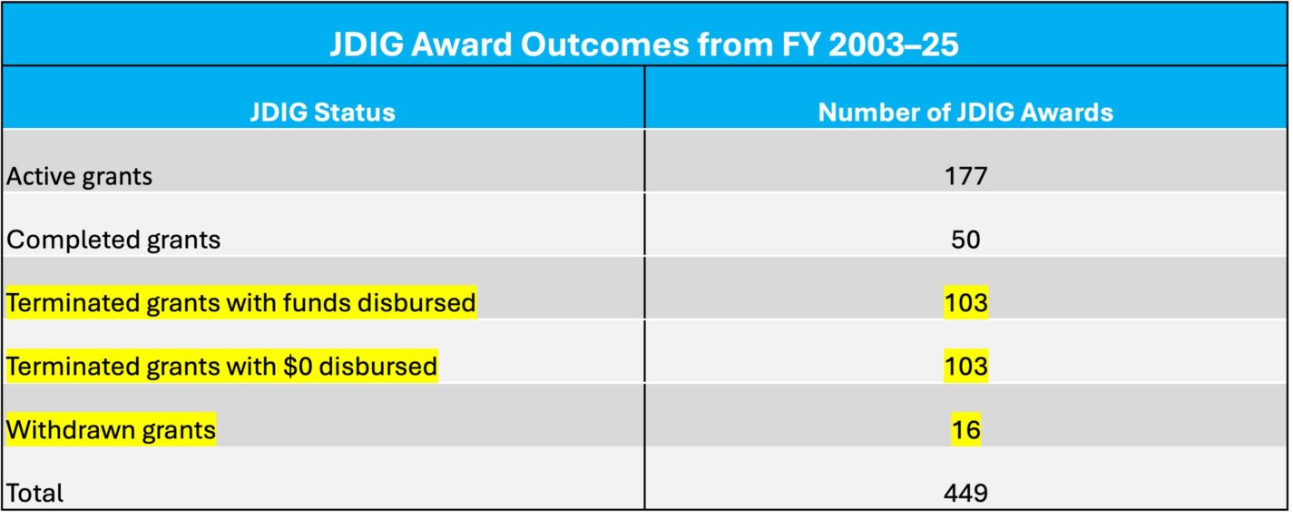 The picture grows even more concerning when examining only the projects that have reached an endpoint. Of the 272 non-active JDIG agreements, only 50 have been successfully completed. The remaining 222 — more than four out of five — were terminated or withdrawn.