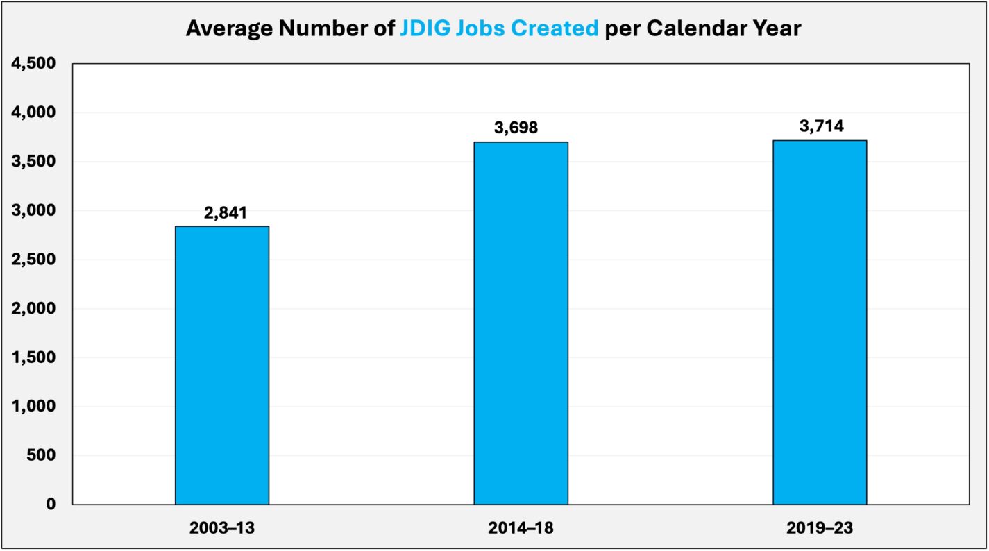 Unfortunately, actual job creation has not followed the same trajectory. From calendar years 2003–2013, JDIG projects created an average of 2,841 jobs per year. The average increased to 3,698 jobs from 2014–2018 and rose only marginally again to 3,714 jobs from 2019–2023.