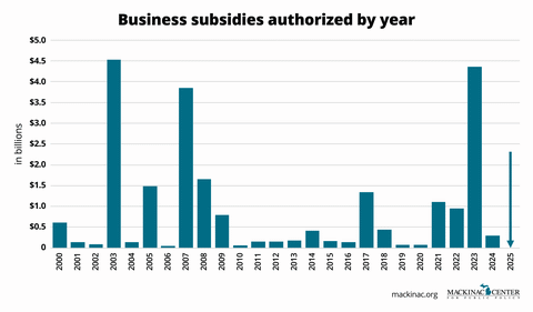 The year 2025 produced little agreement between Michigan’s Republican-controlled House and the Democratic-controlled Senate. That’s not bad news for Michigan taxapyers. Lawmakers went an entire year without approving more spending on select business subsidy programs. That is the first time lawmakers have avoided giving corporate welfare to local favorites since at least 2000, when the Mackinac Center began its Business Subsidy Scorecard.