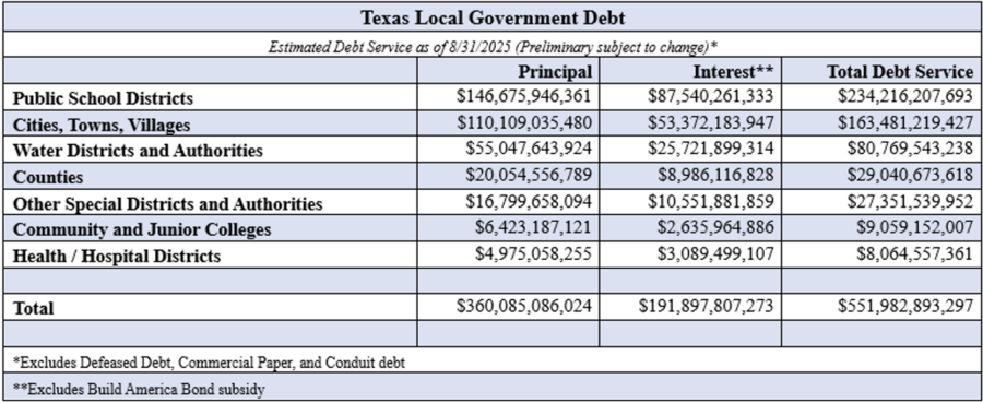Once again, independent school districts (ISDs) were the most heavily indebted type of political subdivision, with ISD debt reaching $234.2 billion or approximately 42% of the total. This sum represents a $31.6 billion increase over the previous year (FY 2024) and indicates that ISDs collectively owe around $42,000 for every student currently enrolled.