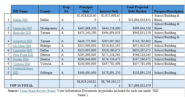 The data gathered is revealing. For instance, Dallas ISD’s $5.93 billion Proposition A is expected to cost almost $12 billion when interest is accounted for. Dallas, Birdville, Lancaster, and Fredericksburg ISDs all expect to pay back more in interest costs than the principal borrowed. And the top 10 largest propositions are projected to cost taxpayers $8.9 billion initially and almost $18 billion upon total repayment.