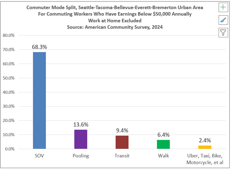 Transit agencies have attempted to address this problem (without really admitting it is a problem) by subsidizing monthly transit passes for low income households through the ORCA LIFT program. But as of 2024 only 12,567 people were enrolled, which is only a tiny fraction of one percent of all lower income households in the County. An ORCA LIFT transit pass entitles the holder to pay a fare of just one dollar on most transit service in the region. That is a bargain, but it doesn’t benefit the 81% of low income commuters who drive or carpool to get to work, and it doesn’t correct the problem of the high regressive taxes used to fund transit.