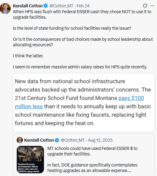 For instance, the IR article highlighted a sad story about Helena Public Schools’ aging boiler system and the lack of funds to repair it. What was left out is that when the Helena district was flush with one-time cash from federal ESSER funds during COVID, which both DOE and OPI explicitly said could be used for facility heating/cooling upgrades, the district chose NOT to use ESSER funds to fix their boiler. Instead, they hired additional staff despite knowing the funds would expire in 2024. Kendall has been covering this story on X: