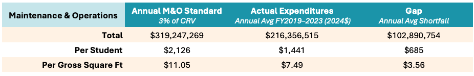 The article referenced a February presentation by the 21st Century School Fund to Montana’s decennial School Funding Interim Commission. 21CSF recommends an annual facility M&O funding level of 3% Current Replacement Value (CRV is the amount required to repair, rebuild, or replace facilities). The report showed Montana’s public school districts were short of 21CSF’s M&O funding recommendation by $103 million a year statewide: