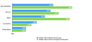 For owner-occupied housing, the median year of construction in New England is 1972. In Southern states it is 1991.