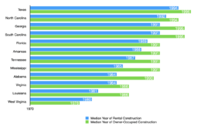 The median year of construction for rental units in New England is 1970. In Southern states it is 1987.