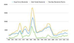 But instead of continuing to boom, that apartment construction collapsed. Building permit data show that approvals for new rental units dropped sharply in the early 1970s and never recovered that level of parity with single-family homes.