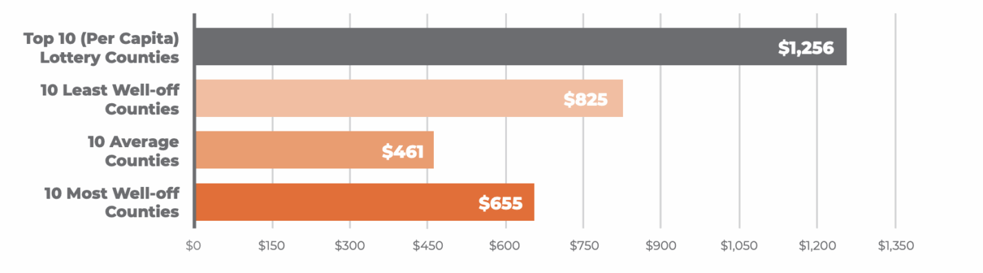 - A review of 2019-20 lottery sales (the most recent data available as of this writing) found the top 10 counties in lottery sales per adult were among the most economically distressed counties in the state. Lottery sales per adult in those counties ($736.53) were almost twice the state average ($374.94) of lottery sales per adult and nearly twoand-a-quarter times greater than the average in the 20 most well-off counties in the state.