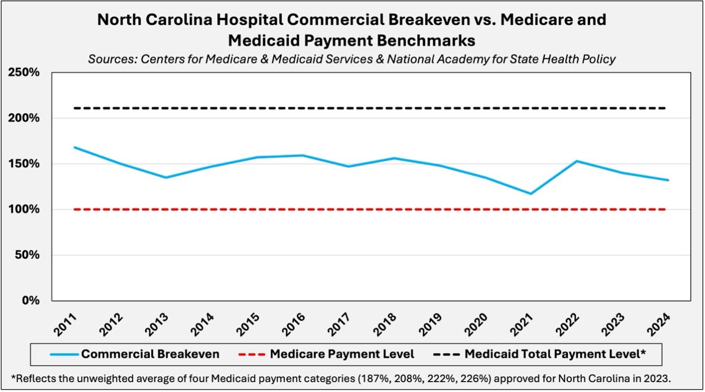 In FY 2023, North Carolina structured its Medicaid financing system to elevate hospital reimbursement far above commercial breakeven levels. As of 2024, the median hospital breakeven rate in North Carolina was approximately 132 percent of the Medicare reimbursement level, yet recent Medicaid payment benchmarks vary from 187 percent to 226 percent of that level.