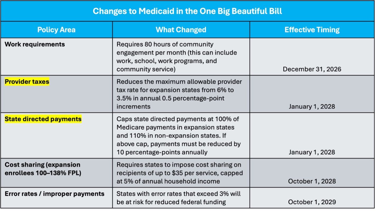 As the provider tax rate limit declines and the state directed payment cap tightens under the OBBB, the state must transition from relying on federal loopholes to building a sustainable program rooted in fiscal discipline.