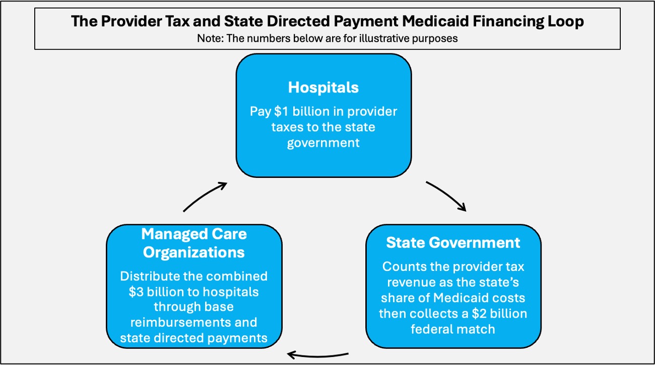 Hospitals pay provider taxes to the state, which are used to pay for the state’s share of Medicaid spending. The state then draws down federal matching funds, increasing the total pool of dollars available.