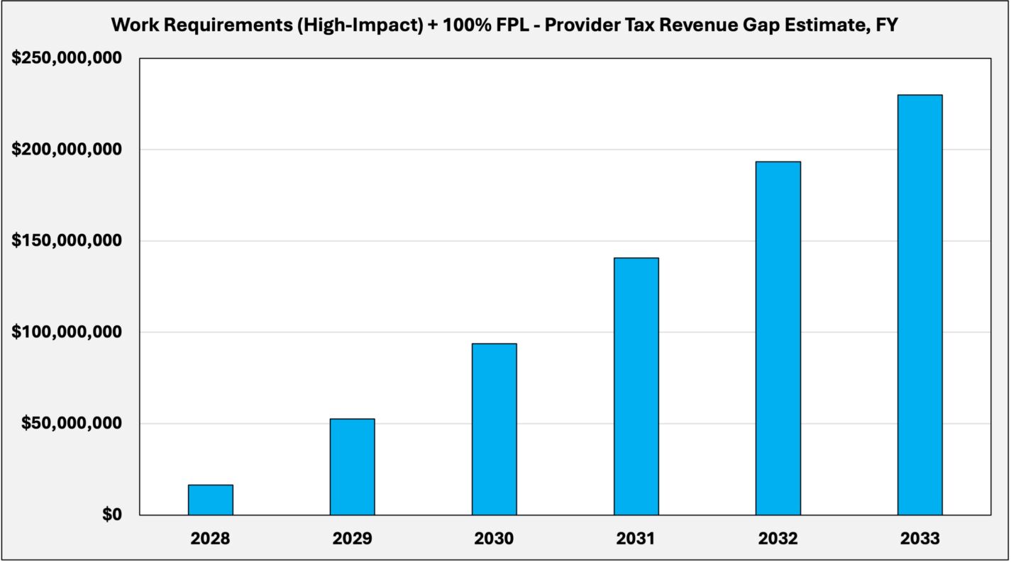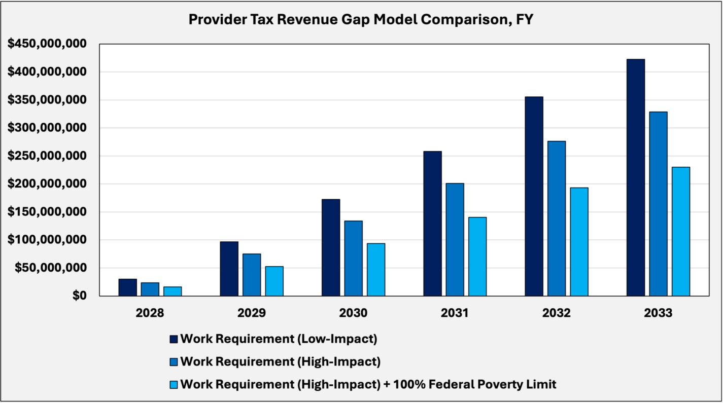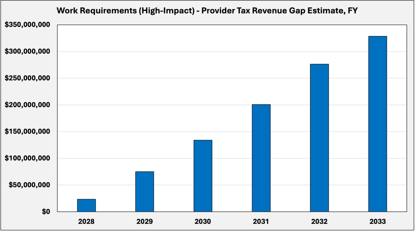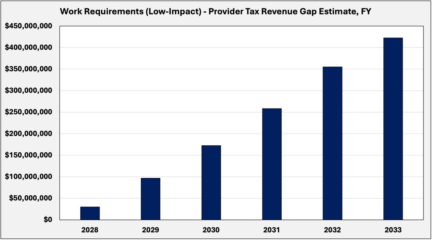 This scenario models the effect of declining provider tax capacity under a low-impact implementation of federal work requirements that take effect in 2027. While the policy is federally mandated, its practical effect depends on how exemptions — particularly the “medically frail” category — are defined and administered.