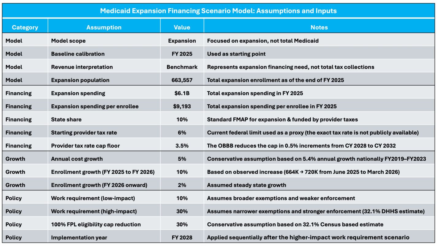 On the financing side, the model assumes a starting provider tax rate of 6 percent, the current federal upper limit. Because the tax rate is not publicly reported and may be lower in practice, this assumption is used as a proxy for the current financing environment. If the actual rate is below 6 percent, the timing and magnitude of the projected gaps would be reduced, with impacts occurring later and at a smaller scale.