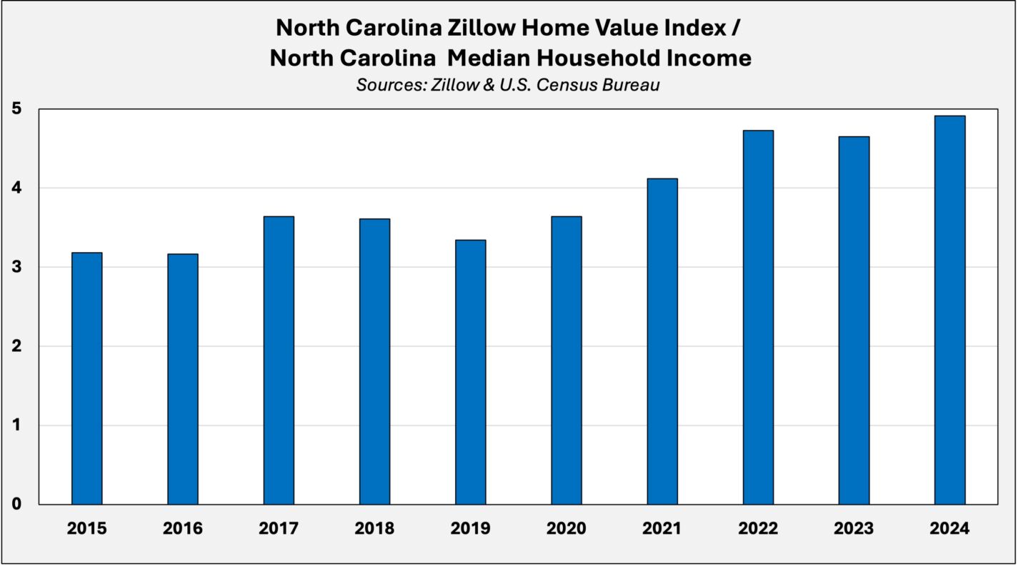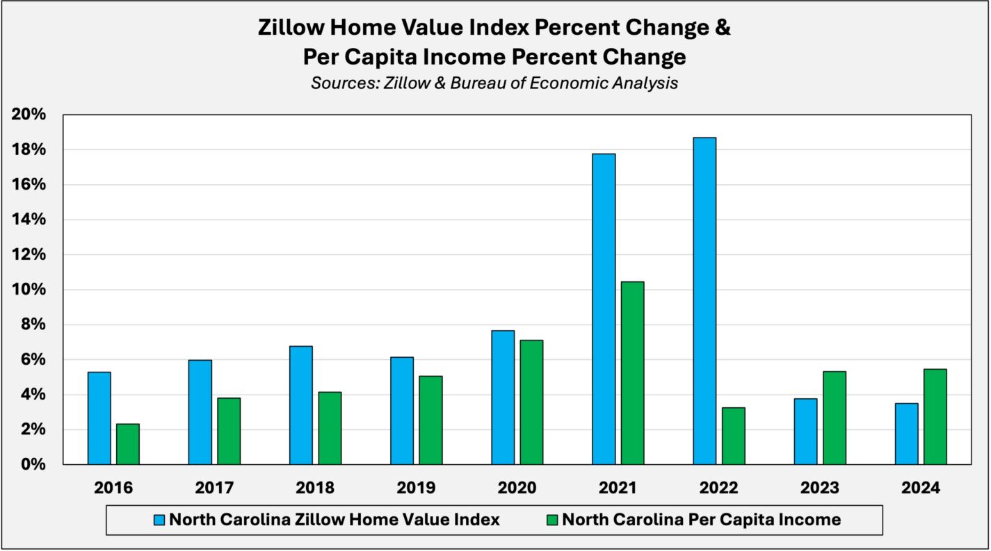 According to the Zillow Home Value Index, from 2015 to 2024, the typical home value in North Carolina rose from just under $162,000 to more than $330,000 — an increase of 104 percent. Meanwhile, over the same period, home values nationwide increased by only 87 percent. This divergence reflects strong migration to North Carolina, which increased housing demand relative to national trends.