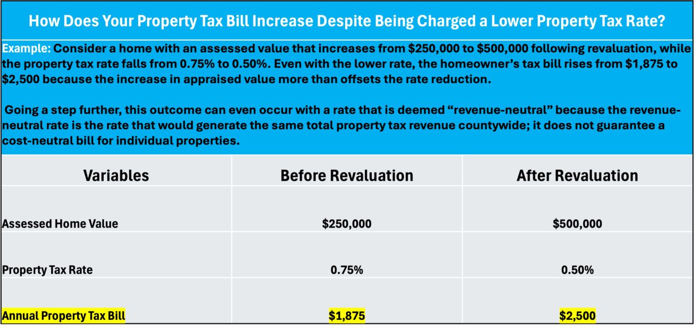 Before exploring policy options, it is crucial to note that over the past three years, 71 counties have conducted revaluations and all subsequently lowered their tax rates, highlighting the rate reductions as evidence of tax restraint. As the following example shows, however, lower rates do not necessarily translate into lower tax bills, which has contributed to confusion among taxpayers.