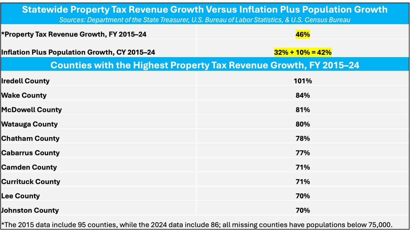 Comparing home value growth with per capita income growth highlights the structural pressure behind rising property tax burdens. From 2015 to 2024, the cumulative growth in per capita income in North Carolina was 58 percent, compared to the 104 percent increase in the value of a typical home. As a result, growth in property values — which determines the property tax base — has exceeded growth in the incomes used to pay property tax bills.