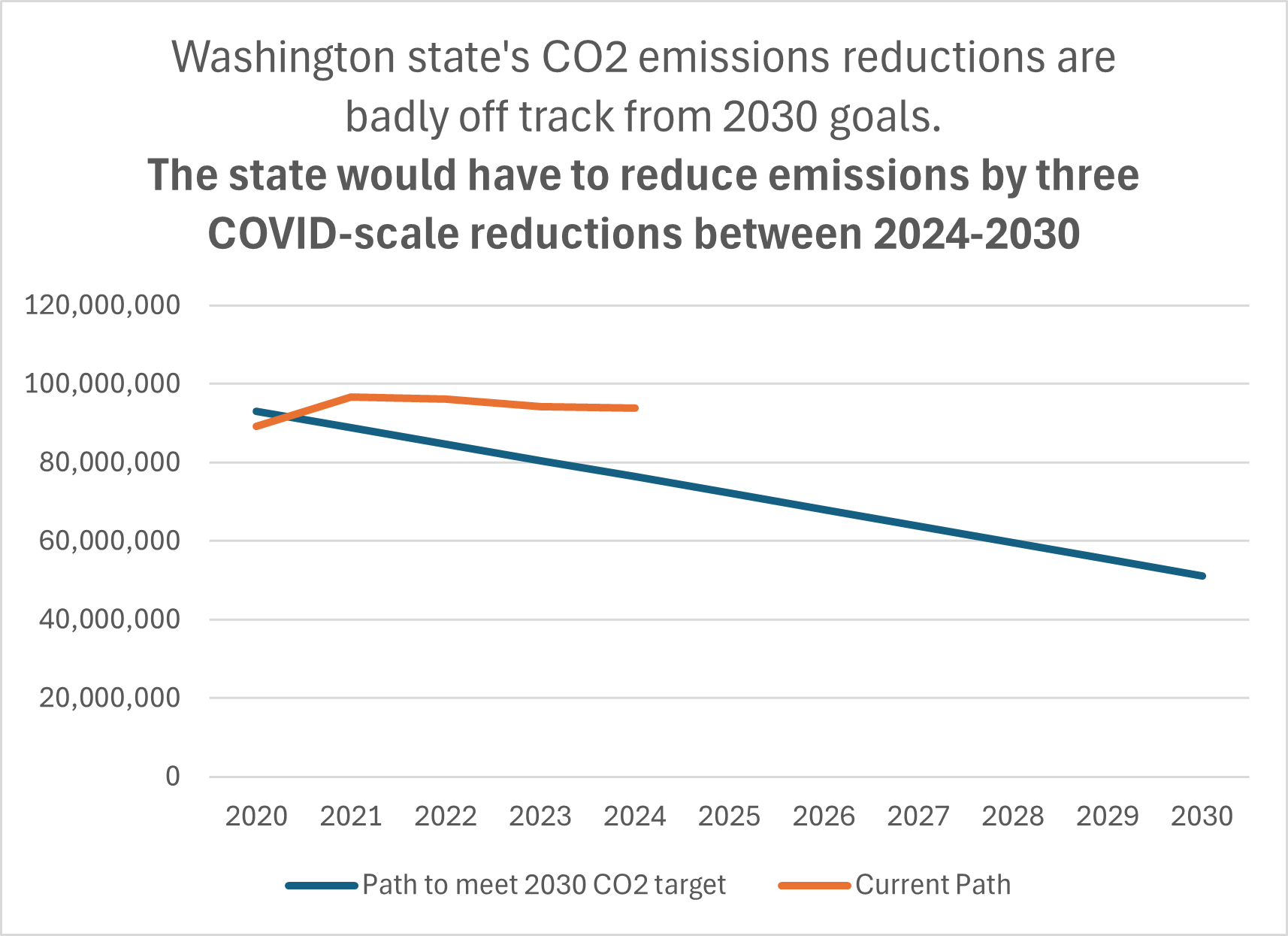 It gets worse. The Department of Ecology has released partial data for 2023 and 2024, indicating that emissions fell less than three percent between 2022 and 2024. If those data hold, Washington state’s emissions would have to fall by 7.4 percent per year from 2025 to 2030, or more than one COVID-scale reduction every two years. This is not going to happen.