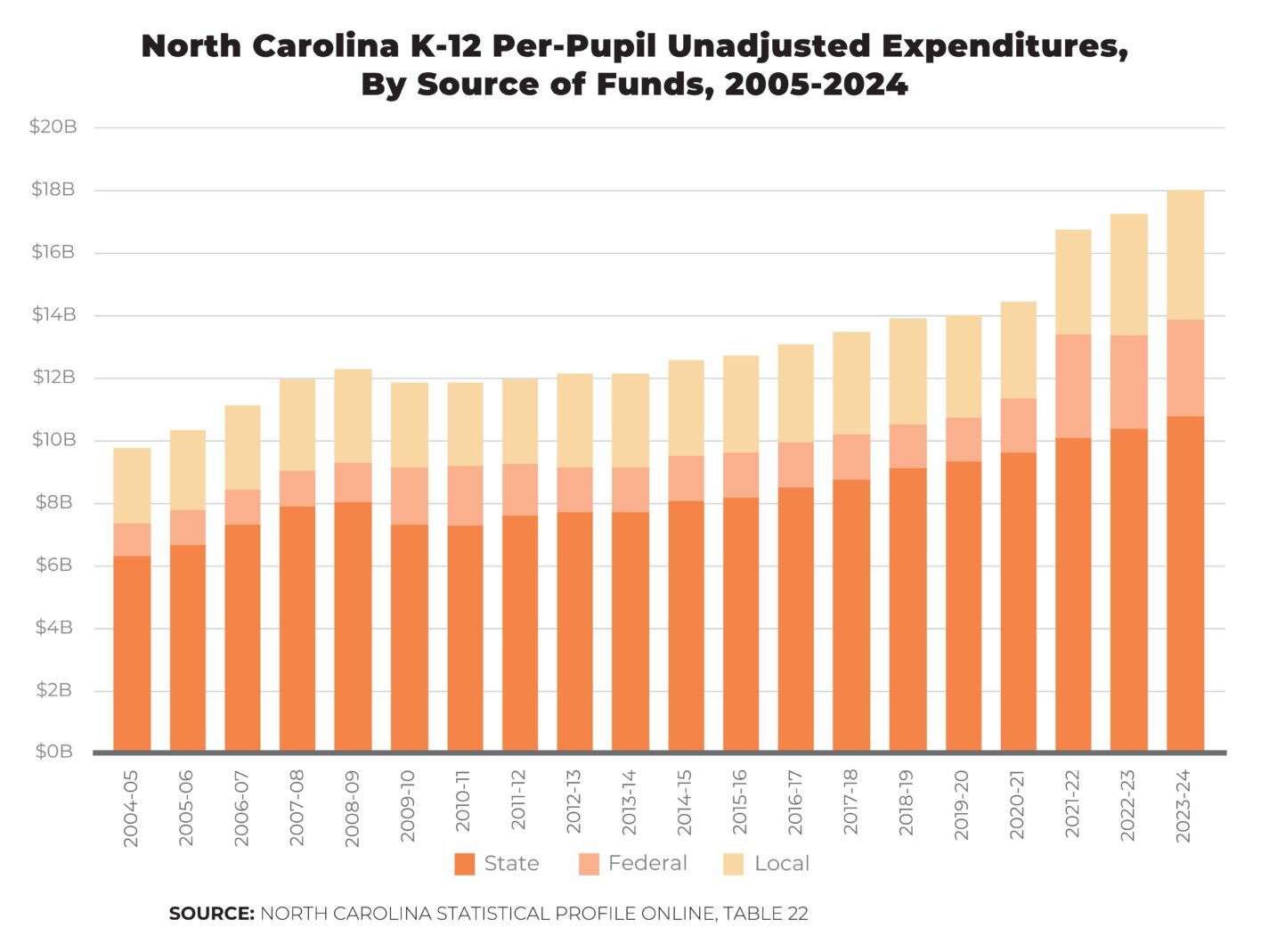 In 2023–24, North Carolina spent $18 billion on K–12 public education. Of that amount, $10.8 billion (59.7 percent) came from state government, $3.1 billion (17.2 percent) came from the federal government, and $4.2 billion (23.1 percent) came from local governments.