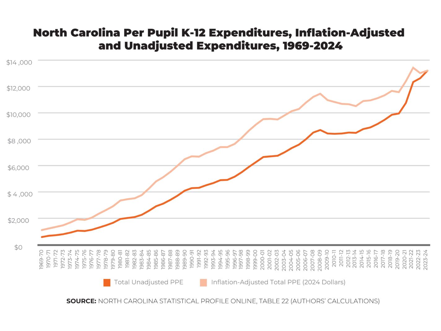 - In 2023–24, North Carolina spent an average of $13,222 per K–12 student in federal, state, and local operating funds.
