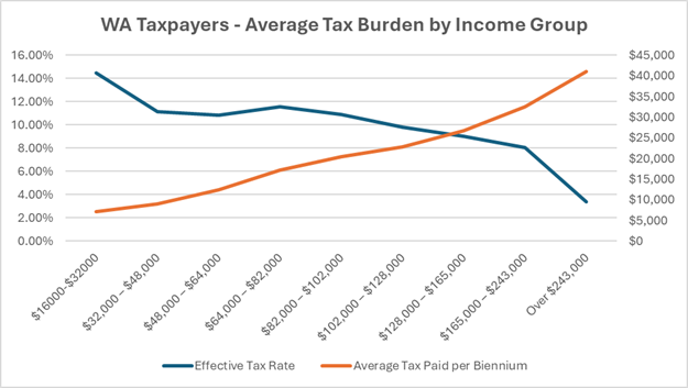 According to the Department of Revenue (DOR), taxpayers earning over $243,000 pay approximately $41,020 in state and local taxes per biennium. Those in the lowest bracket ($16,000-$32,000) pay an average of $7,206.
