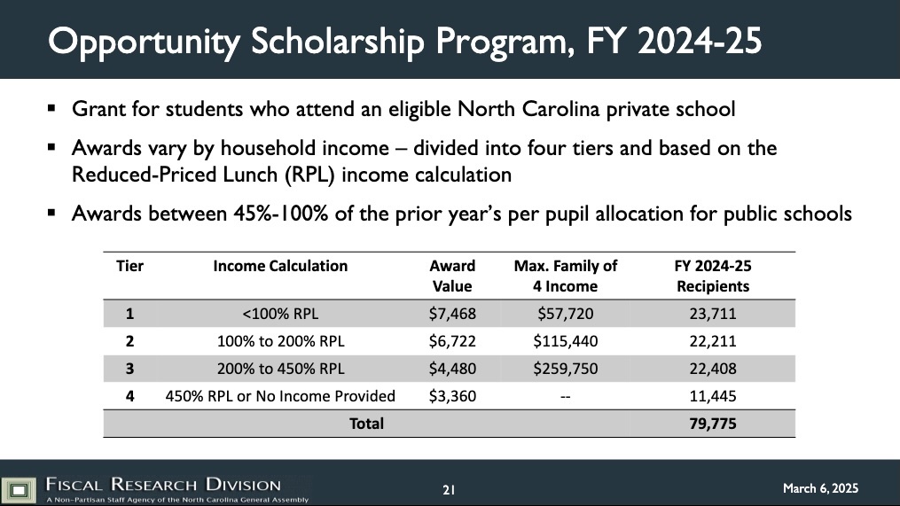 Recall that the neediest families continue to be prioritized by the Opportunity Scholarship program. Not only are families in the lowest-income tier eligible to receive the largest award (up to $7,686 per year in 2025–26 compared with only up to $3,458 for families in the highest-income tier), but all applications from families in the lowest-income tier must be awarded before any other new applications (not considering renewals).Furthermore, a March 6 presentation by Stephen Bailey of the General Assembly’s Fiscal Research Division showed that the plurality of Opportunity Scholarship recipients in 2024–25 (29.7 percent) came from the lowest-income tier, while the tier with the fewest recipients (14.3 percent) was the highest-income tier. The same was true of applicants during the 2025–26 priority application period (29.5 percent were from the lowest-income tier, and 16.5 percent were from the highest-income tier).
