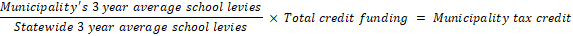The total amount of the credit statewide is predetermined by the Legislature. It currently is set at $1.275 billion. The Wisconsin Department of Revenue distributes this total to municipalities proportionally to school property tax levies paid over the last three years, according to this formula:
