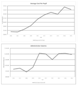 Here are Exeter’s charts showing the annual change in average per pupil spending and total administrator pay over the last decade. It’s easy to see how these basic graphics can stimulate productive conversations about local spending priorities and their tax impacts.