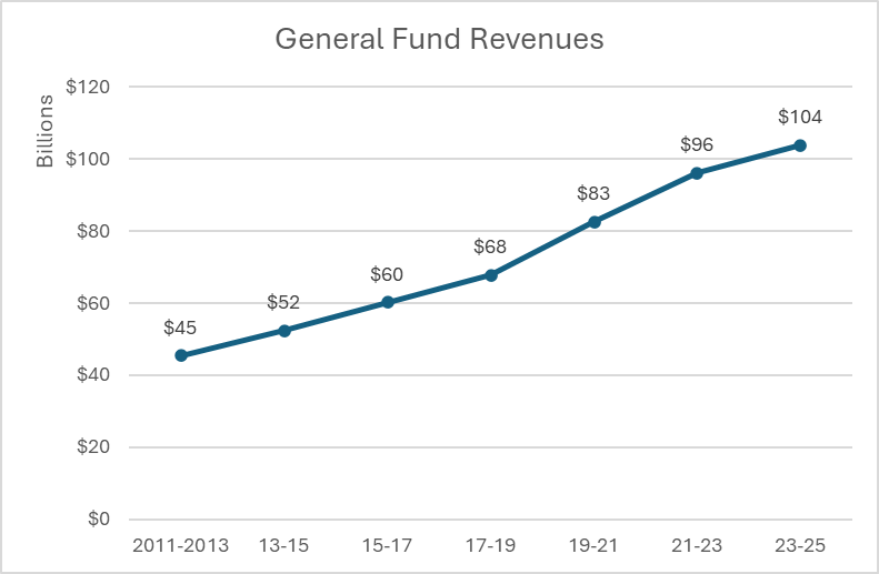 For the 2025-27 biennium alone, employees got a 3% raise effective July 2025 and another 2% in July 2026. This follows 4% and 3% increases in the previous biennium. Add in the new $18 minimum wage floor and other regulations for state employee pay, and taxpayers are looking at roughly $3 billion in new costs for this biennium alone. That’s now baked into the permanent baseline for all future budgets.