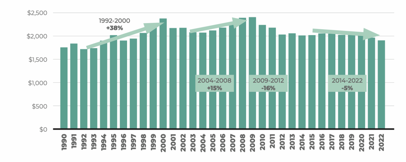 - In FY 1989-90, when the John Locke Foundation was launched, General Fund appropriations per person, adjusted for inflation, was $1,672. After peaking in FY 2008-9 at an inflation-adjusted $2,414, appropriations in FY 2021-22 were back to $1,913.