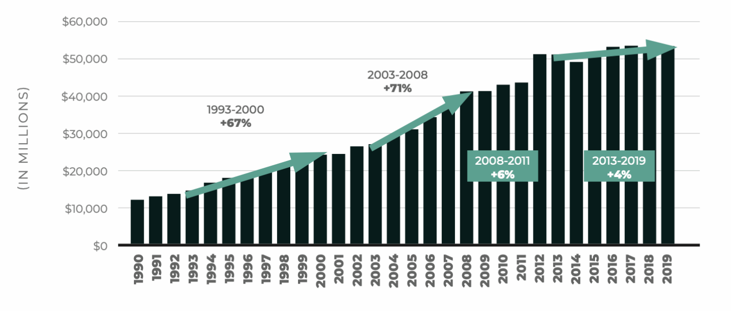 More specifically, however, the majority of General Fund expenditures are dedicated to paying salaries and benefits to employees and retirees. A 2022 Locke Foundation article reported that roughly 73 cents of every General Fund dollar spend goes toward employee salaries, employee health insurance benefits, pension contributions, and retiree healthcare benefits.