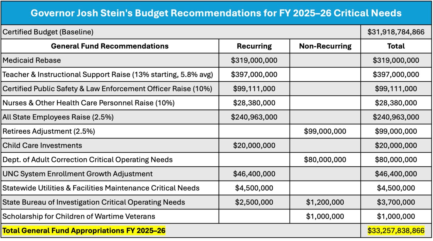 Now, in March, Stein has declared the Medicaid shortfall urgent and proposed a “Critical Needs Budget” for FY 2025–26 to address “funding needs that cannot wait until next year.” The proposal primarily focuses on funding the Medicaid rebase and increasing compensation for teachers and other state employees.