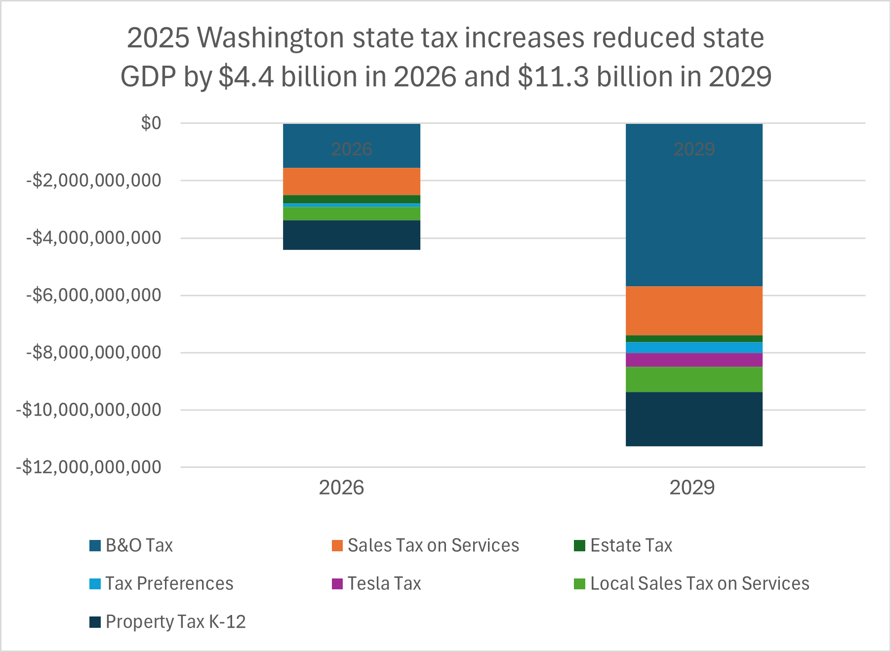 An independent study of the economic impacts of Washington’s 2025 tax increases – the largest in state history – is projected to reduce economic growth by half a percent of state GDP and cut wages by about $3.7 billion in 2026. The impact grows to a reduction of 1.2 percent in state GDP and $8.5 billion in lost wages by 2029.