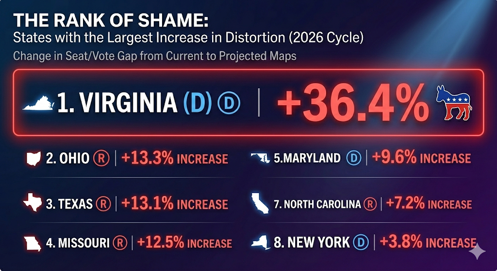 Among all states examined in current redistricting battles – and none of them should be doing this — Virginia would experience the single largest increase in distortion, a +36.4-point expansion in the seat/vote gap.  No other state comes close.