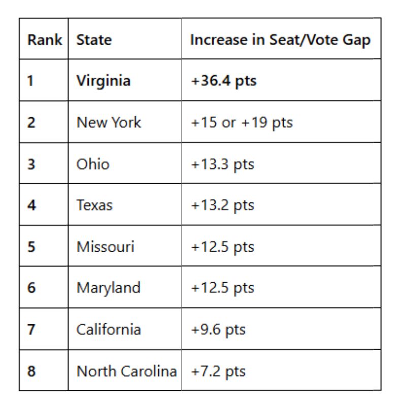 The largest seat/vote gaps in the dataset are overwhelmingly in blue states. Virginia would vault to the top of that list.  Virginia’s seat/vote gap would almost triple the gaps in each of Texas, Ohio, and Missouri.