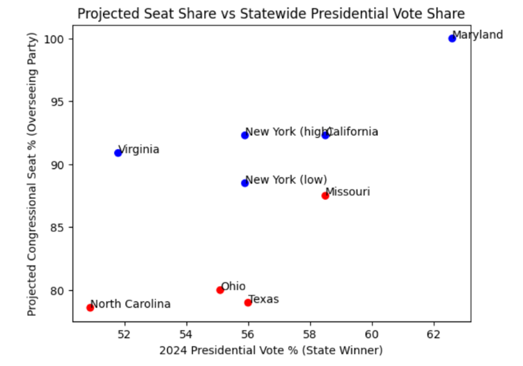 Using current congressional delegation data and 2024 presidential vote totals, we can measure fairness in a straightforward way: compare a party’s statewide vote share in the last Presidential election to the percentage of congressional seats it holds. Basically, the larger the gap between popular votes and Congressional seats, the more distorted the map. Yes, it is a crude measure, but it is insightful and measurable across all states.