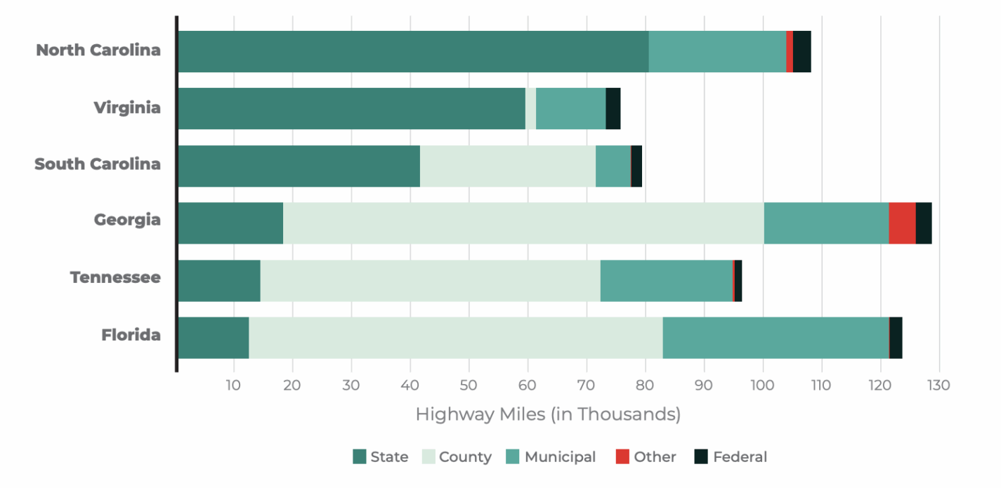 In fact, North Carolina is one of only five states where the state government owns more than half of the road miles in the state. As a result, to build and maintain roads, its road network depends far more on user fees from the federal and state gas taxes, license fees, and vehicle sales tax than it does on local property taxes.