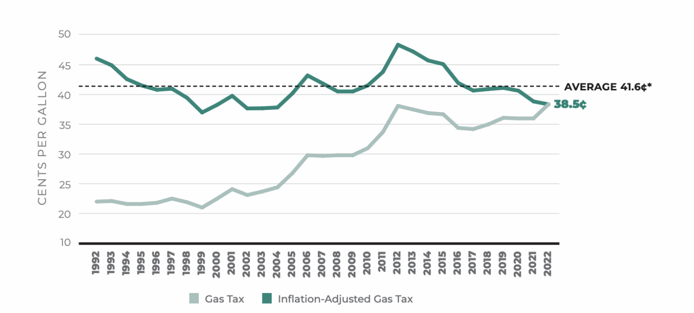 - Because of the proliferation of more fuel-efficient vehicles, including an increase in electric vehicles, raising revenue from the motor fuels tax to pay for roads will remain a challenge. The current gas tax rate of 38.5 cents (as of the end of 2022) comes in a little shy of the inflation-adjusted 41.6-cent average over the past 30 years.